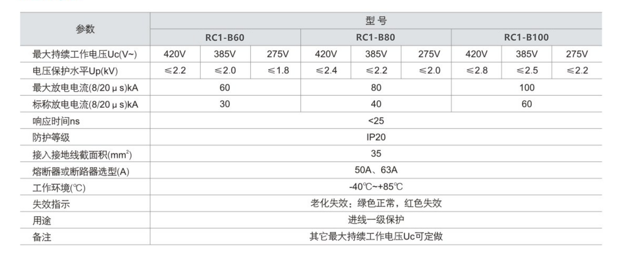 RC1-B系列電涌保護器(簡稱SPD)適用于交流50/60Hz,380V及以下的TT、IT、TN-S、TN-C-S等供電系統,可作為LPZ1、LPZ2與LPZ3區界面處的等電位鏈接,其設計依據負荷IEC61643-1、GB18802.1,外殼設計安裝在35mm電氣導軌上,該產品內置失效脫離裝置,當電涌保護器因過流過熱、擊穿失效時,失效脫離裝置能自動的將其從電網上脫離,同時可視告警模塊由綠色(正常)變成為紅色(故障)。